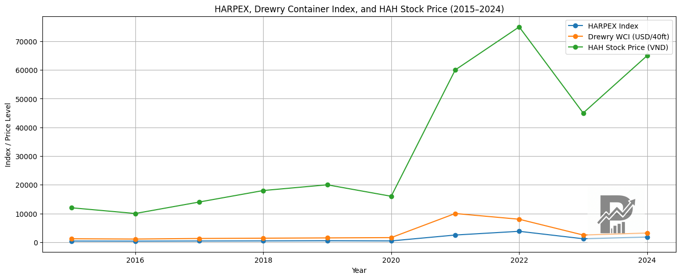 Biểu đồ cho thấy mối quan hệ khá rõ giữa chu kỳ vận tải container và diễn biến cổ phiếu HAH trong giai đoạn 2015–2024.
