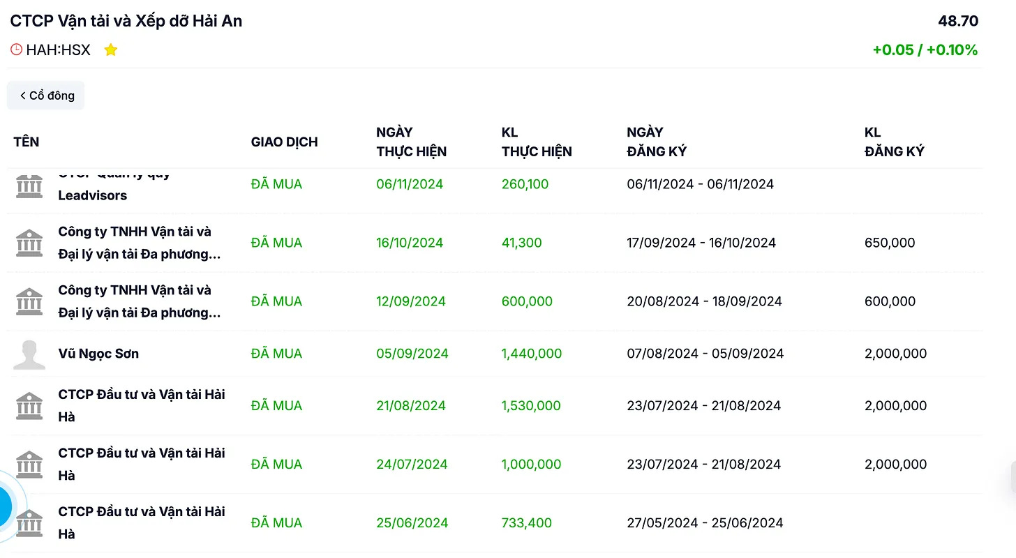 Một yếu tố đáng chú ý là việc các cổ đông lớn và người liên quan đến ban lãnh đạo đã liên tục mua vào cổ phiếu HAH trong thời gian gần đây.
